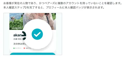 ペアーズを利用するためには2段階の本人確認が必要で、確認済みの会員は「本人確認バッジ」が付与され信用できる相手がすぐに分かります。