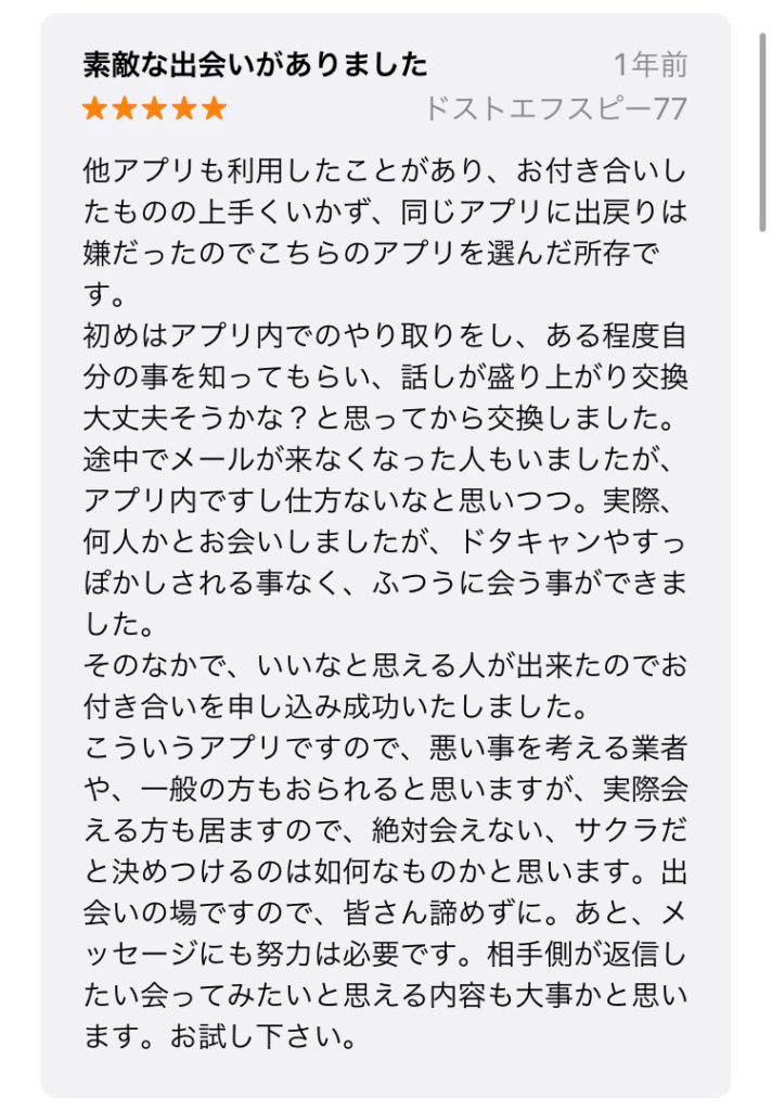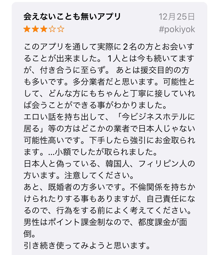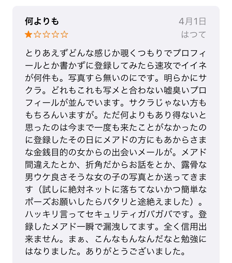 例えば、出会い系アプリでこのようなクチコミを見たことはありませんか?