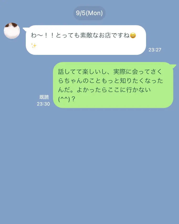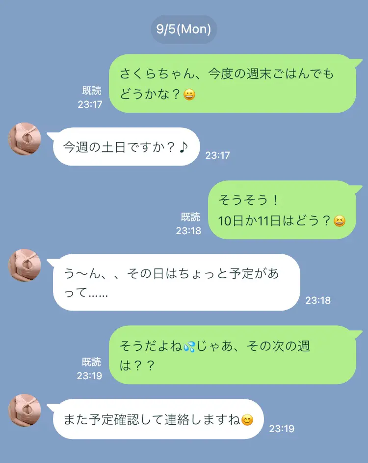 サクラはサービス内で活動するものなので、デートに誘うと何かしらの理由をつけて断ってきます。メッセージでは楽しく話していたのに、いざデートのお誘いをすると断られたり濁されたりした場合はサクラを疑いましょう。