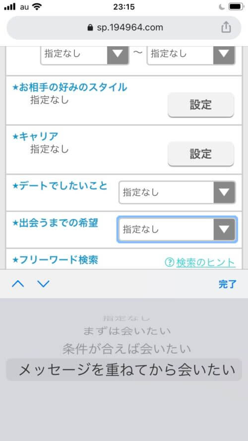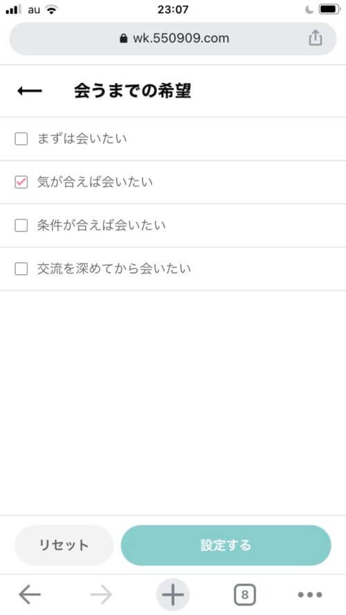 - 出会うまでの希望で「気が合えば会いたい」に設定する