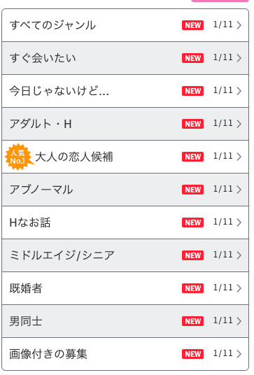 例えば、アダルト要素を含む「その他募集」には、「大人の出会い」「刺激的な出会い」などのセックス目当ての人が集まるジャンルがあります。