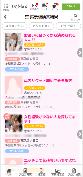 PCMAXで割り切り女性と出会うために、まずはアダルト掲示板で好みの条件で検索しましょう。アダルト掲示板には多くの割り切りプレイ希望の女性が投稿しています。