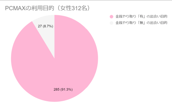 PCMAXには割り切り女性が多くいます。ラブフィード編集部でPCMAXにいる女性312人の利用目的を調査したところ、以下のような結果になりました。