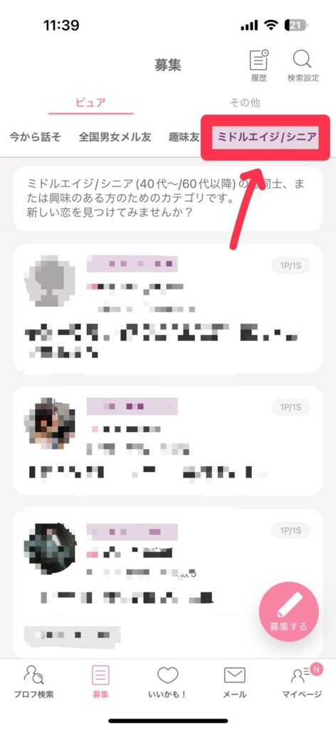 ピュア募集には、さまざまなカテゴリがありますが、熟女を探すときは、「ミドルエイジ/シニア」を選択しましょう。