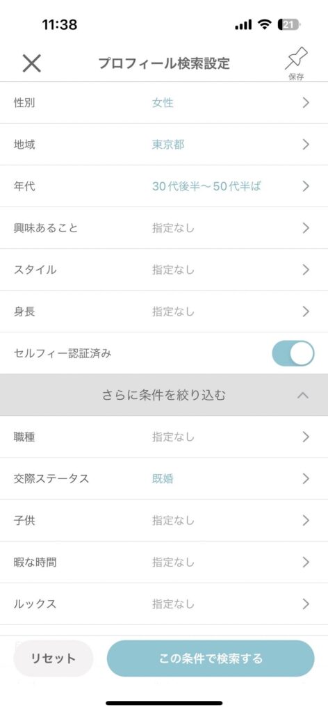 セルフィー認証済みにチェックすることで、大方の業者を排除できるので非常におすすめです。また、交際ステータスを既婚に設定すれば、人妻を探せます。