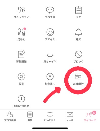 アプリ版からweb版に移る際は、マイページの「web版へ」をタップすることで、簡単に行えます。
