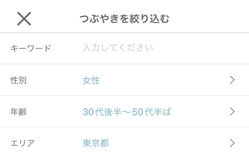 つぶやき機能からも熟女を探せます。つぶやきから探す際も、検索機能を活用することが必須です。女性を選択し、好みの年齢と地域を設定しましょう。
