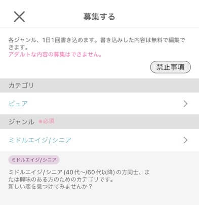 募集は、各ジャンルにつき1日に1回投稿できます。熟女と出会いたい場合は、ジャンルを「ミドルエイジ/シニア」に設定しましょう。